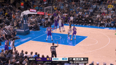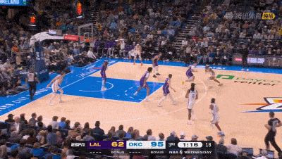 易边再战,东契奇两罚全中,霍姆格伦和里夫斯先后跳投得手,米切尔抛投命中,亚历山大两罚全中拉开到34分。八村垒命中三分,斯玛特命中罚球,东契奇跳投得手缩小分差。亚历山大跳投得手,华莱士先是扣篮命中然后两罚全中,东契奇吃到技术犯规,亚历山大命中罚球。里夫斯两罚中一,亚历山大上篮命中拉开到36分。暂停之后,东契奇连续得分打出6-2,亚历山大连续给出回应,以赛亚-乔命中压哨三分后,雷霆队100-64领先湖人队结束第三节比赛。