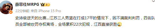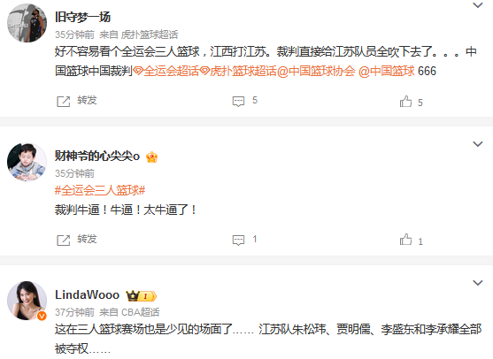 媒体人“LindaWooo”发文点评:“这在三人篮球赛场也是少见的场面了…… 江苏队朱松玮、贾明儒、李盛东和李承耀全部被夺权”