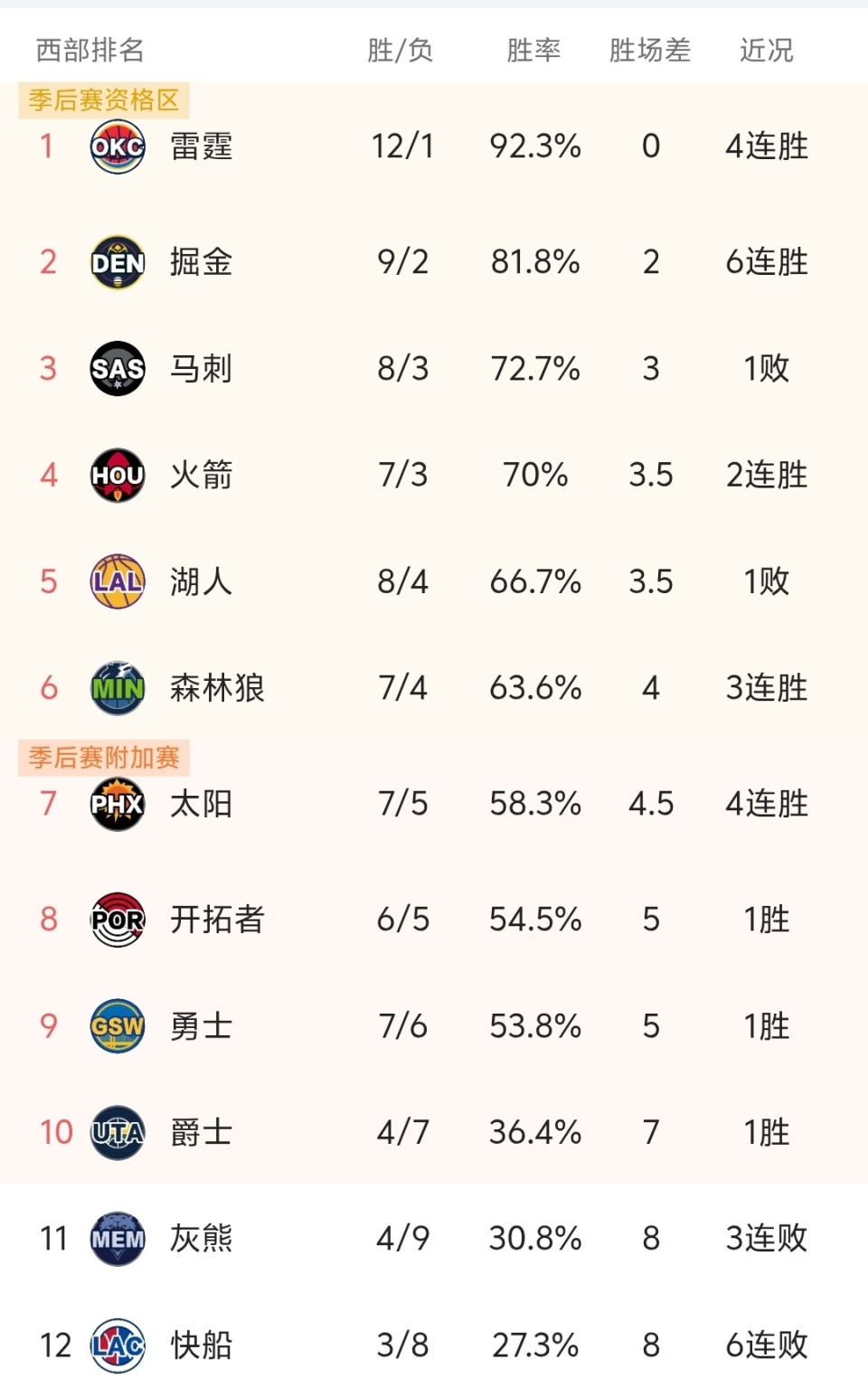 北京时间11月13日,NBA常规赛,洛杉矶快船队主场116-130不敌丹佛掘金,遭遇6连败,目前快船排名西部第12,休斯顿火箭队主场135-112击败了奇才,两连胜的火箭重新回到了西部第四,洛杉矶湖人队客场92-121不敌雷霆,湖人被火箭反超,排名西部第5,勇士队客场125-120击败了马刺,不过勇士依然只能排名西部第9,马刺队被掘金超越,排名西部第3!