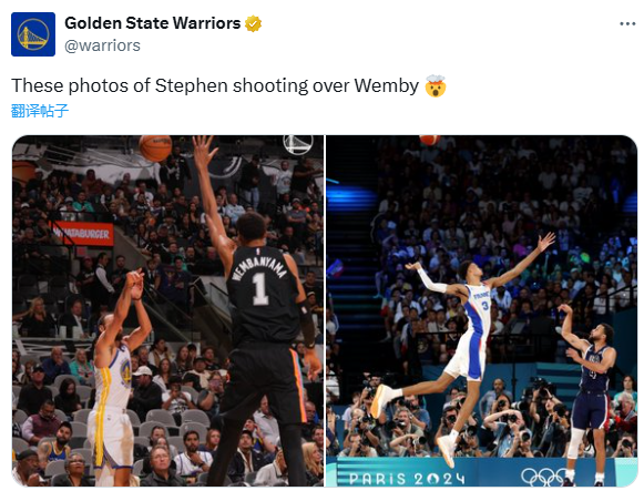 勇士官方也晒出库里仅差一场追平乔丹的海报,配文写道:斯蒂芬跻身精英之列;勇士官方还晒出库里在奥运会赛场上和NBA赛场上迎着文班亚马投篮的画面。