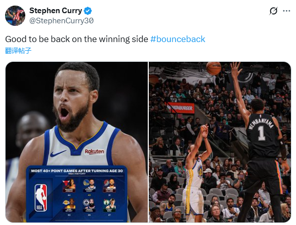 库里更新社媒,晒出自己的纪录以及迎着文班亚马投篮的赛场照,写道:“重返胜利轨道,感觉真好。#反弹”