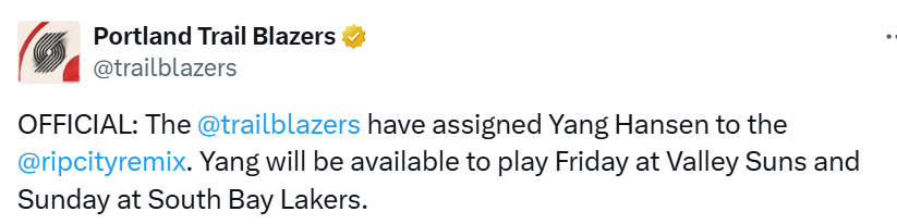 开拓者官宣下放杨瀚森:本周六迎发展联盟首秀 将连续出战太阳湖人