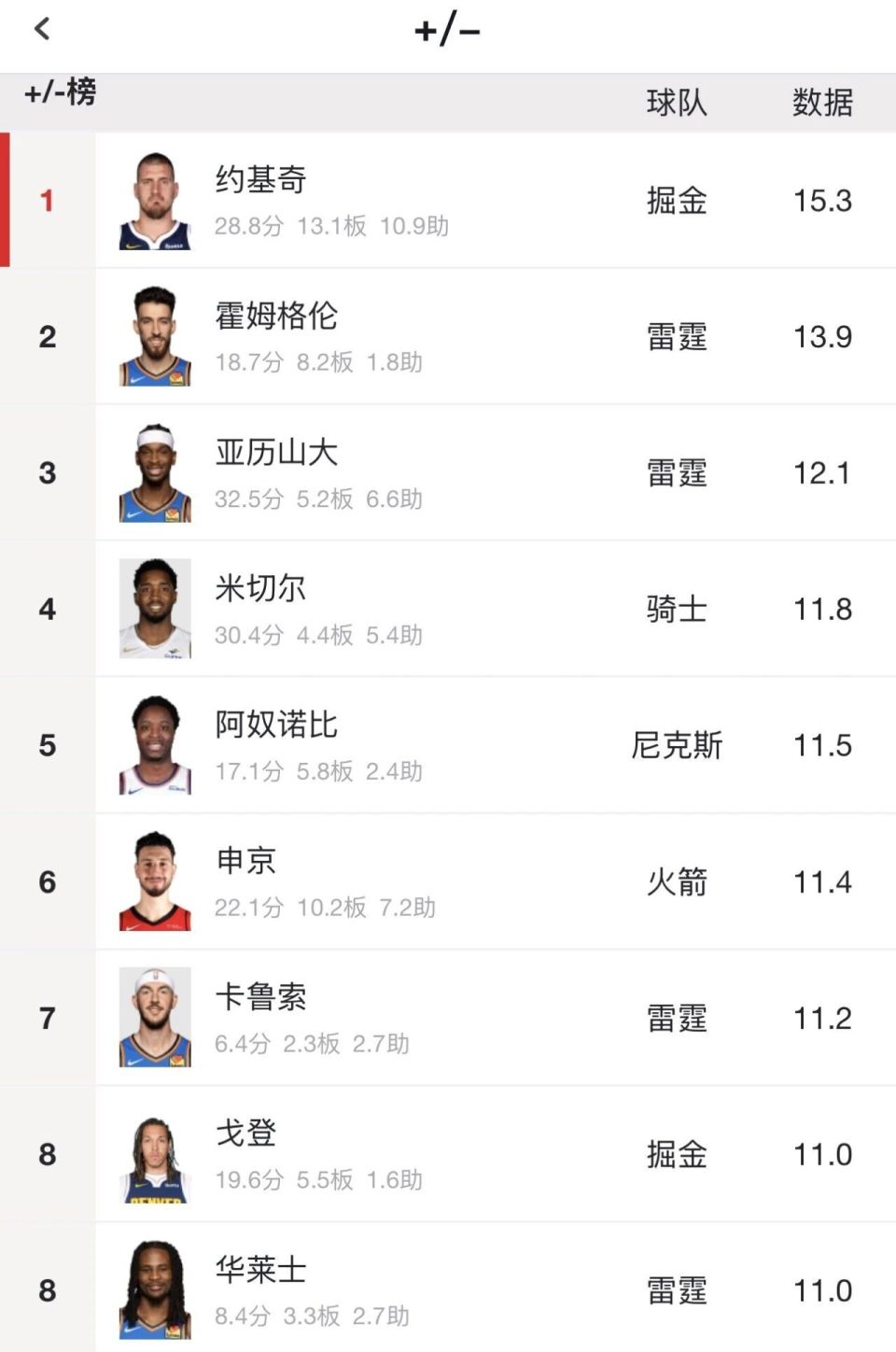 新赛季第一期MVP排行榜,亚历山大稳居第一。本赛季他场均出战33.9分钟,得到32.5分5.2篮板6.6助攻1.3抢断1盖帽1.7失误,三项命中率:52%,35.4%,90.1%。亚历山大雷霆生涯189次单场30+,追平威少并列队史第二,仅次于杜兰特(246)。