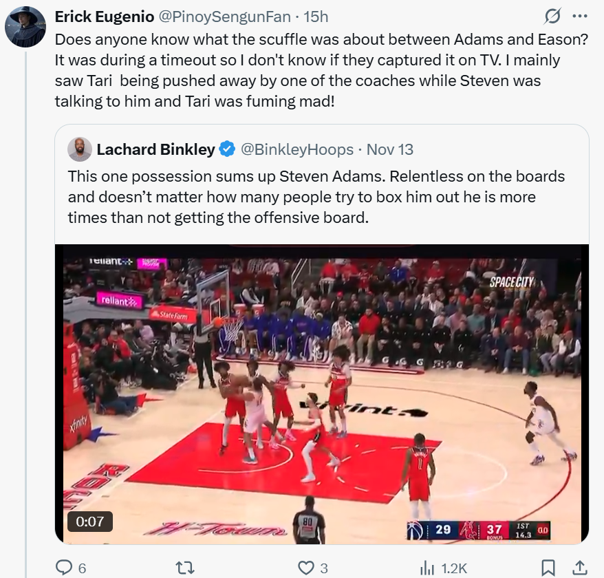 事件起因是一名现场观战的球迷在社媒转发亚当斯高光集锦的同时,询问有谁知道伊森与亚当斯两人之间因为什么发生了冲突?自己当时在现场看到亚当斯在与一名助教沟通后,直接推开后伊森,后者看起来气得够呛。