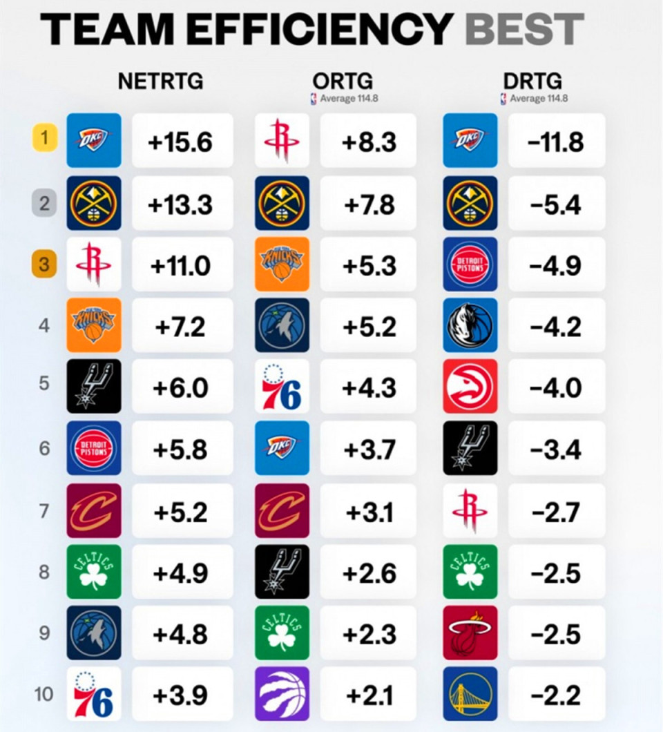 更何况火箭队目前高歌猛进,过去8场拿下7胜1负战绩,开季至今进攻效率联盟第一,防守效率也回暖至联盟第七,净效率仅次于雷霆与掘金位列联盟第三。