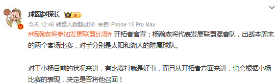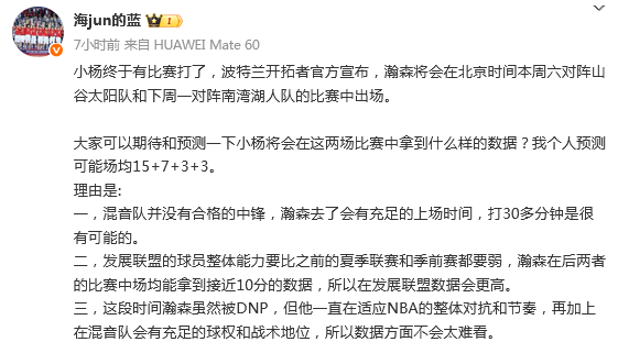 媒体人“海jun的蓝”更新社媒发文点评:“小杨终于有比赛打了,波特兰开拓者官方宣布,瀚森将会在北京时间本周六对阵山谷太阳队和下周一对阵南湾湖人队的比赛中出场。