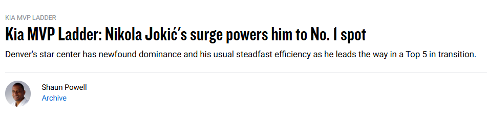 北京时间11月14日,NBA官网更新了MVP排行榜,约基奇升至首位。和上周一样,前五位依然都是国际球员。以下是具体排名和解析——