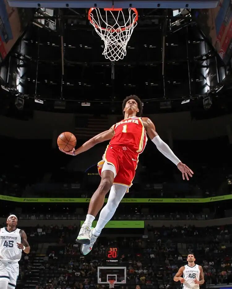 杰伦-约翰逊攻防一体,堪称新的鹰王。他出生于2001年12月18日,还不满24周岁,身高2米03,身高2米03,臂展2米14,2021年首轮20号秀。2024年10月,老鹰给他一份5年1.5亿美元的续约合同,本赛季开始执行,2030年到期。