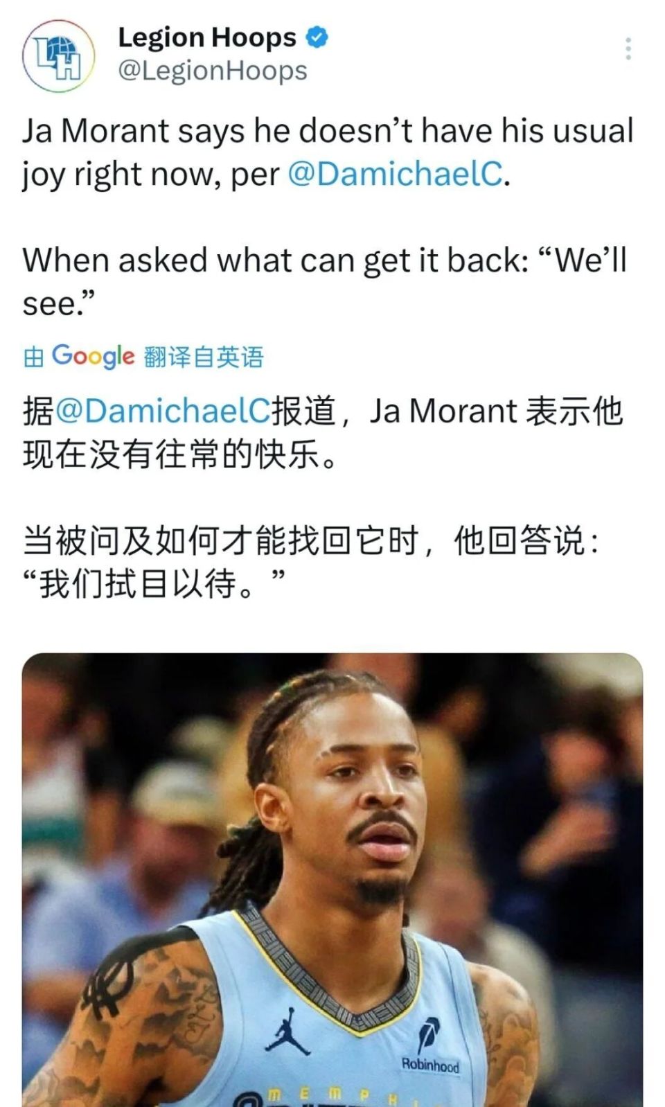 按莫兰特如今无比糟糕的状态,以及灰熊目前暂时以4胜9负仅排名西部第12名的战绩,或许交易的步伐正越来越近了......
