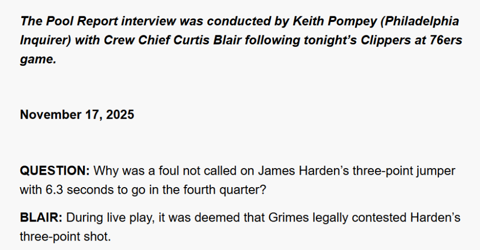 记者提问:“第四节还剩6.3秒时,詹姆斯-哈登的三分出手为何没有被判罚犯规?”