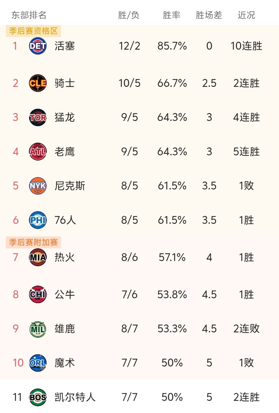 随着活塞127-112赢球,豪取10连胜,NBA东部变天,最新排名乱套了!