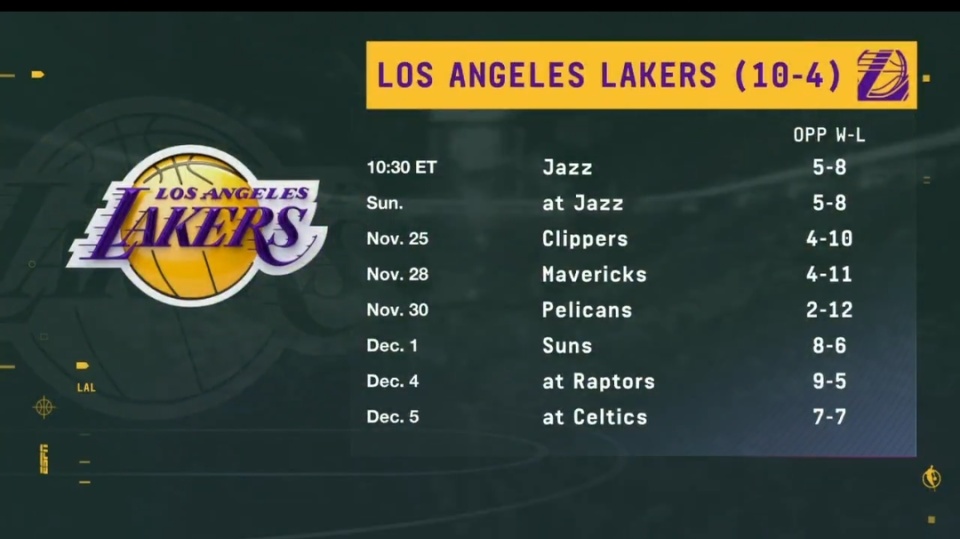 湖人近期将开启一段“甜蜜赛程”,连续5场的对手胜率不超过50%,依次是爵士(两场)、快船、独行侠和鹈鹕。随后他们将连续对阵当前8胜6负的太阳、9胜5负的猛龙和7胜7负的凯尔特人。