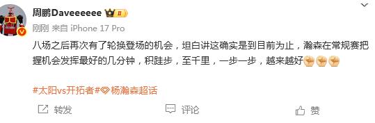 媒体人周鹏发文点评:八场之后再次有了轮换登场的机会,坦白讲这确实是到目前为止,瀚森在常规赛把握机会发挥最好的几分钟,积跬步,至千里,一步一步,越来越好。