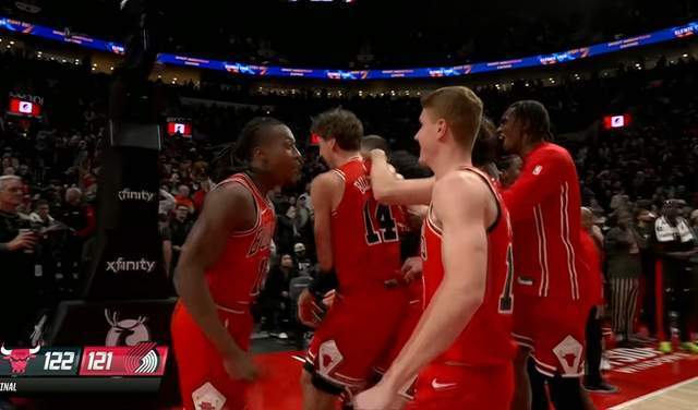 随后公牛还接连犯错,怀特传球直接被抢断,可随后阿夫迪亚罚球两罚一中,开拓者领先4分,怀特三分命中将功补过,分差只剩下1分,悬念还有。随后格兰特的罚球又是两罚一中,开拓者只领先2分,公牛暂停之后怀特突破到内线,开拓者居然收缩内线空出了武切维奇的点,怀特立马传球,后者接球出手,球进灯亮完成了压哨绝杀,公牛拒绝了21分的超级大逆转。