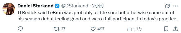 今日湖人队仍旧没有比赛,他们进行了日常训练,训练结束后雷迪克透露,詹姆斯可能有些肌肉酸痛,但除此之外,他在赛季首秀后的感觉良好,并且全程参与了今日的训练。