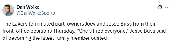 湖人队已经解雇了小老板乔伊-巴斯和杰西-巴斯,shams进一步报道,杰西声明表示:巴斯博士的想法是,有朝一日由我和乔伊来管理篮球运营。但实际上珍妮稳固了自己的位置,而她的兄弟姐妹都被解雇了。