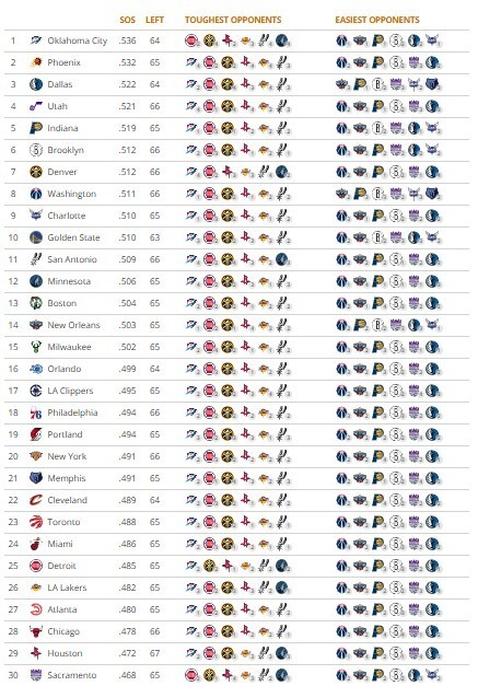 NBA各队剩余赛程难度:雷霆第一,勇士第10,湖人第26,火箭第29