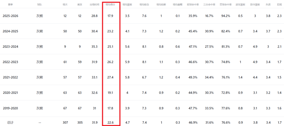 本赛季至今,因为灰熊打法的变化,以及和主帅执教理念不合,场内场外均受挫的莫兰特,出战12场比赛里,场均上阵28.8分钟,仅仅得到17.9分3.5板7.6助3.8失误1断,投篮命中率35.9%,进攻效率十分低下,甚至可以说伤害到了球队。