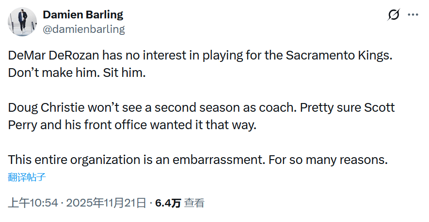 对此,ESPN 1320 Sacramento的媒体人Damien Barling更推,谈到了国王的现状:“看起来德罗赞对继续为国王队效力毫无兴趣。别强迫他,让他坐冷板凳算了。克里斯蒂看起来也不会迎来第二个执教赛季。几乎可以确定总经理斯科特-佩里及其管理层早就有意解雇他。这整个组织就是个彻头彻尾的笑柄——无论从哪个方面看都是。”