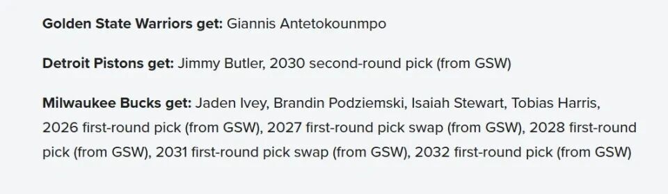 勇士得到字母哥;活塞得到巴特勒+30年次轮签;雄鹿得到艾维+波杰姆斯基+斯图尔特+哈里森+26年首轮签+27年首轮签互换权+28年首轮签+31年首轮签互换权+32年首轮签。