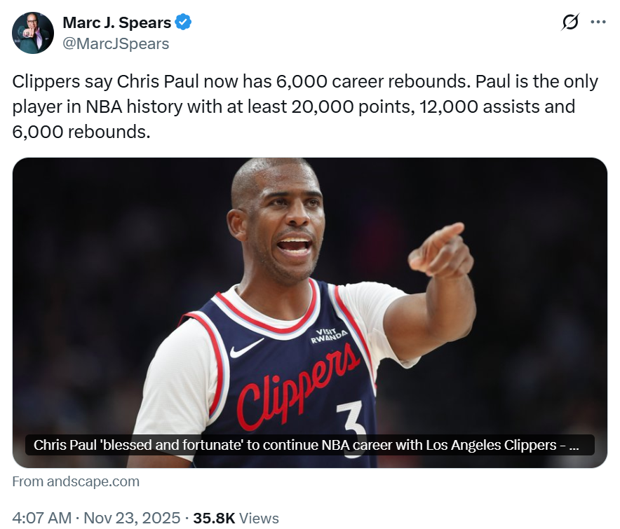 面对这名老将的退役,快船记者Jamal Cristopher发文称赞道:“他是篮球史上最伟大的球员之一,以他这样的身材达到这样的高度,能够与CP3真是我的荣幸。”