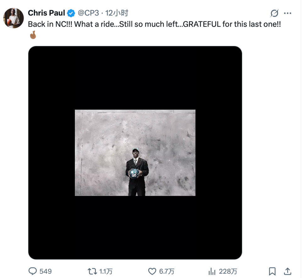 回到北卡州,是指今天这一场客场打黄蜂,保罗出生于北卡罗纳州。