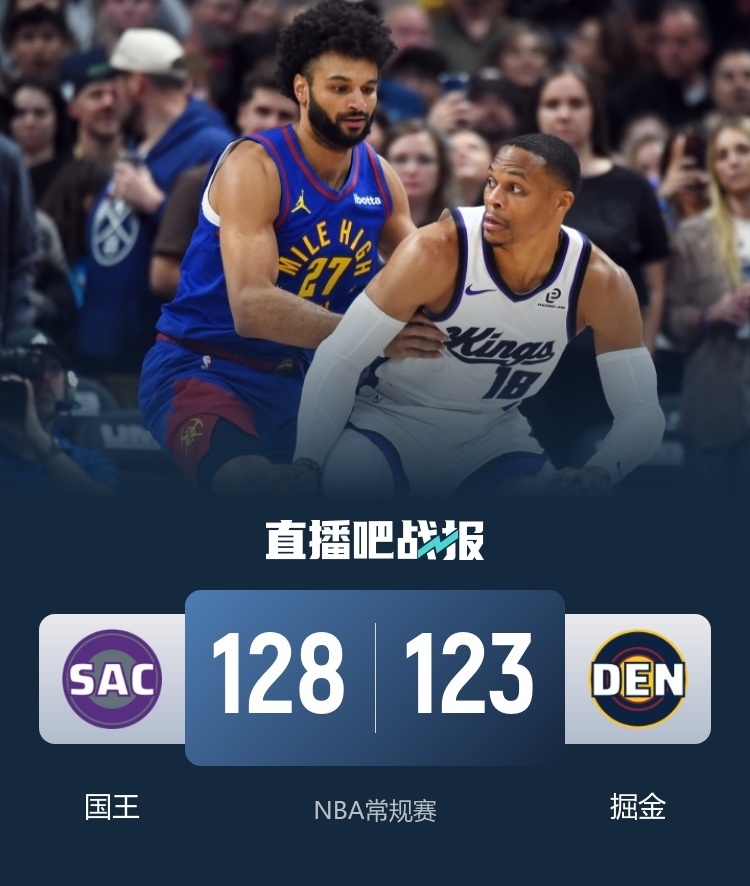 下半场,掘金占得先机打出12-2获得两位数优势,基根·穆雷挺身而出连得8分带队迅速迫近比分,施罗德单节12分带队反超,末节威少接管比赛,内外开花连得7分,约基奇里突外投带队追赶,威少开启无敌模式,三分命中后负角度跳投还有,约基奇三分续命,德罗赞关键2+1后约基奇三罚都有,德罗赞两罚全中杀死比赛。最终,国王128-123力克掘金,结束了自己的8连败。
