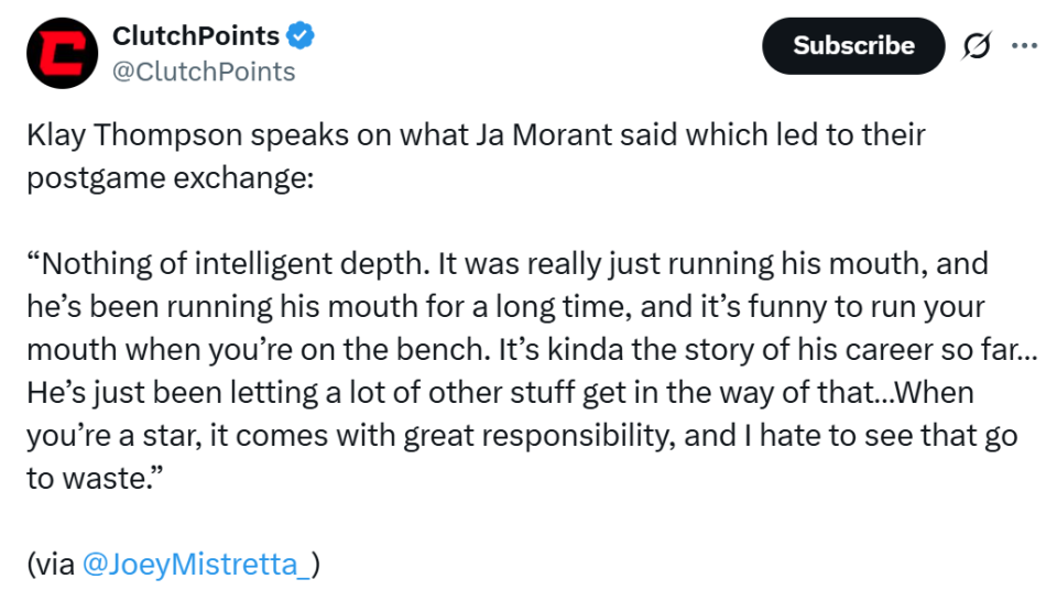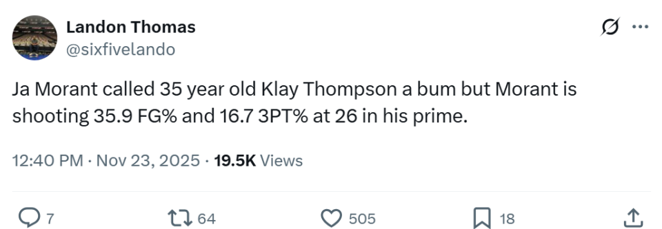 独行侠记者Landon Thomas赛后补刀到:“莫兰特说35岁的克莱是废物,然而26岁正值巅峰的自己本赛季投篮命中率35.9%,三分命中率16.7%。”