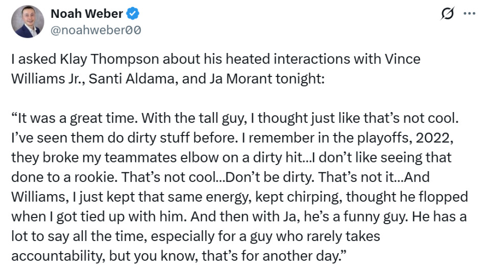 克莱提到的肮脏动作是22年勇士季后赛对阵灰熊,小佩顿上篮时被当时还效力于灰熊队的狄龙拉拽倒地,并在空中被狄龙打到头部,狄龙当场吃到二级恶犯被驱逐,小佩顿则遭遇手臂骨折。