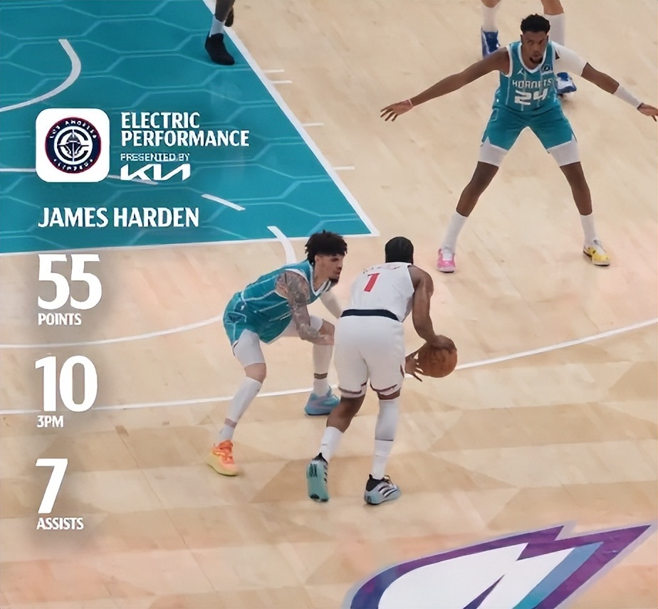 哈登又打出了炸裂一战,以65%的命中率拿到55分7助攻3篮板1抢断,这场比赛他命中了10个三分球,36岁的哈登梦回2019年,这55分也是快船队史单场新高,这10个三分也是快船单场最高。