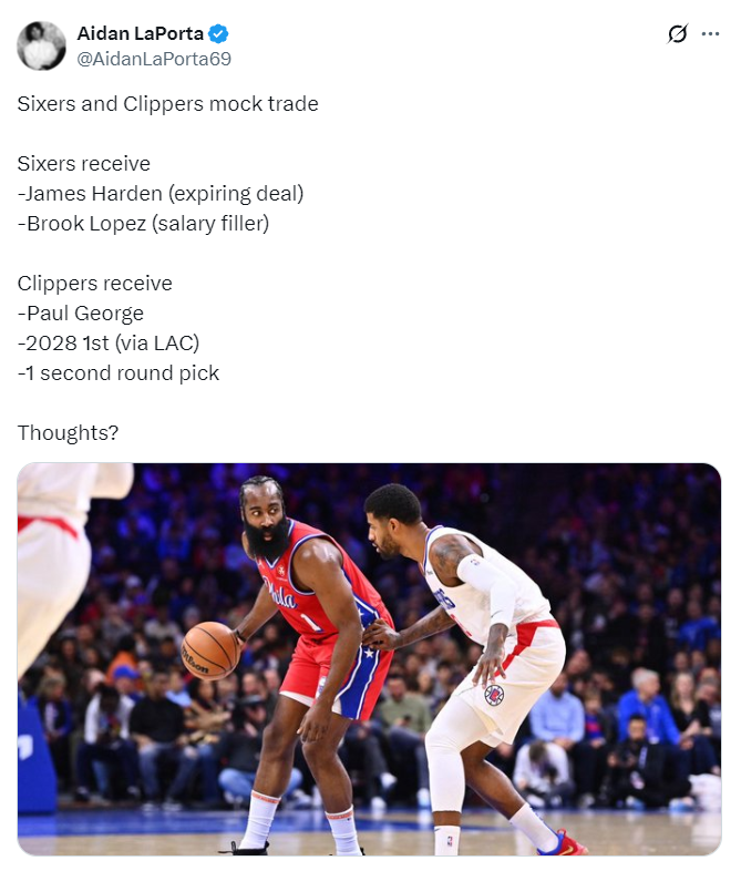 他还建议费城、快船进行交易,费城送出保罗-乔治、快船2028年首轮、1个次轮签从快船换来哈登、大洛,也就是3换2,让乔治重返洛杉矶联手伦纳德,帮助哈登重返费城联手马克西、恩比德。