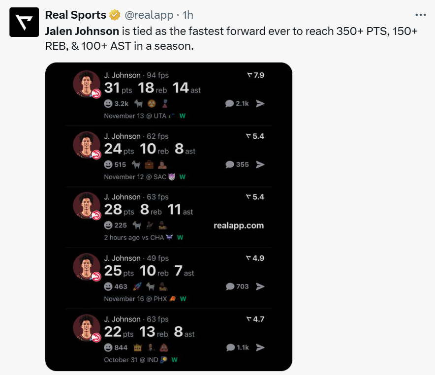 在持续交出亮眼表现的情况下,杰伦约翰逊不仅在上周荣膺东部周最佳,更是成为NBA历史上拿下至少350分150篮板100助攻最快的前锋之一。