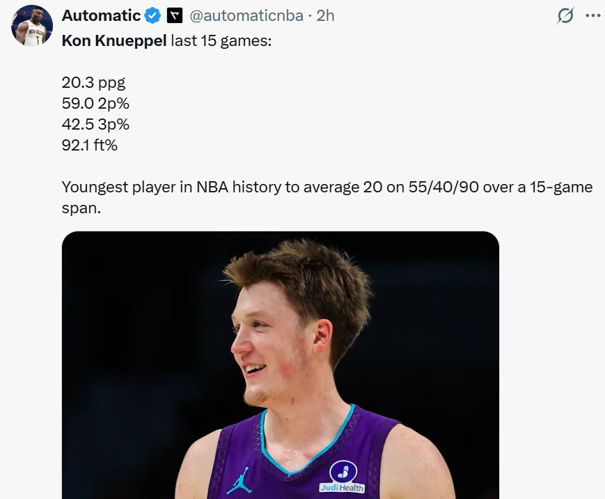 凭借这样的表现,20岁的克努佩尔成为NBA历史上能够在连续15场比赛中,以至少55/40/90%命中率场均拿到20+得分最年轻的球员。
