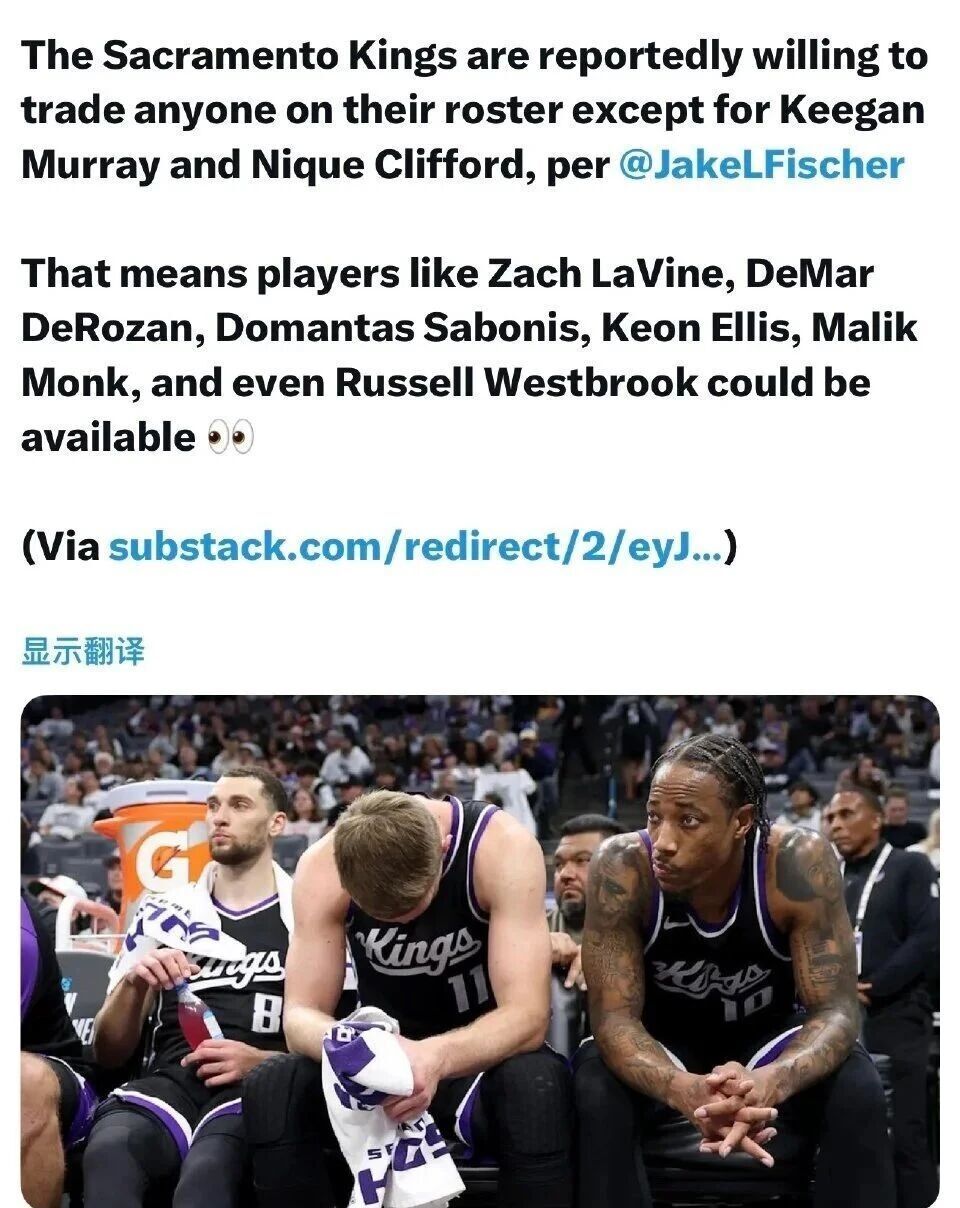 国王(目前4胜13负西部倒数第二)决定重建,除了25岁的默里以及今年首轮24号秀克利福德之外,其余球员有一个算一个全部摆上货架。