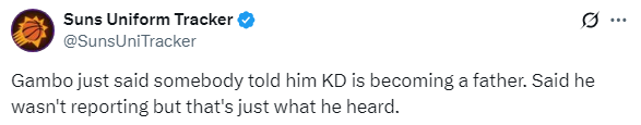 北京时间11月25日,NBA常规赛继续进行,杜兰特因个人原因缺战前东家太阳,太阳记者、亚利桑那体育电台主持人John Gambadoro在节目中报道,杜兰特要当爸爸了;但他也表示,这并不是官方报道,只是他听说的内容,并未经过核实,也不确定其准确性。