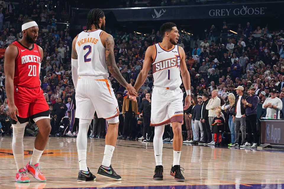 火箭:杜兰特缺席,阿门28分7板8助、霍勒迪22分2板2助2断、申京18分5板5助、史密斯17分7板1助2断2帽。太阳:狄龙29分3板2断、布克18分3板5助、吉莱斯皮16分2板2助2断、奥尼尔12分5板。