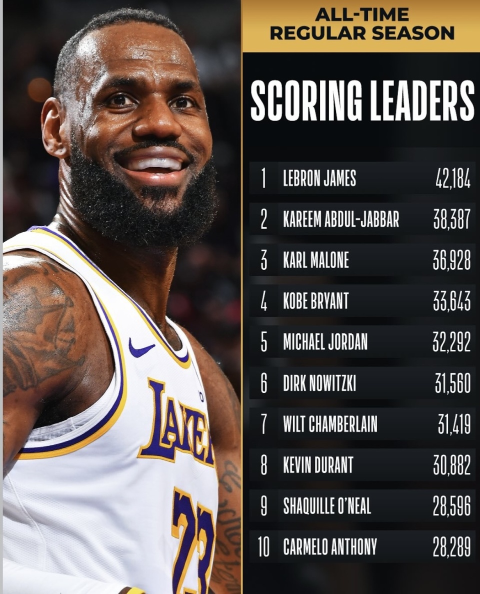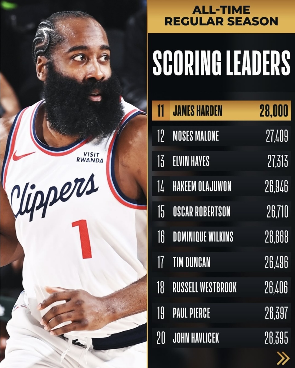 NBA历史常规赛得分榜发布!哈登突破28000分 前十近在咫尺