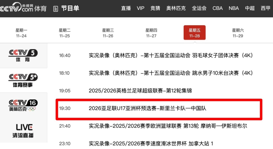 作为国家级体育转播平台,央视体育频道(CCTV5)和体育赛事频道(CCTV5+)对节目单进行了临时调整。根据最新的节目编排显示,CCTV5 将在同一时段播放《全运全记录》节目,回顾全运会的精彩瞬间;而 CCTV5+ 频道则将直播 2026 亚足联 U17 亚洲杯预选赛中国队对阵斯里兰卡队的比赛。这意味着,截至目前,央视两大体育频道均未安排中国男篮对阵韩国队这场重头戏的现场直播。对于习惯通过电视屏幕为国家队助威的亿万球迷而言,这无疑是一盆冷水。