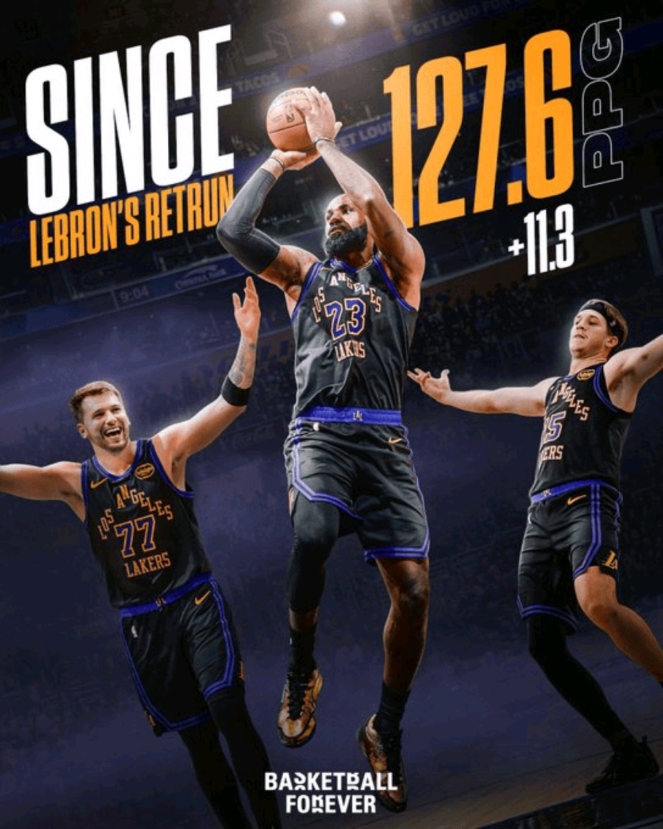 北京时间11月27日,在湖人昨天以135-118战胜快船的NBA杯小组赛中,勒布朗-詹姆斯全场贡献25分6篮板6助攻,这是本赛季他复出后的第3场比赛。而更令人惊讶的是,湖人全队的场均得分从他回归前的116.3分猛增至127.6分,暴涨11.3分的数据让湖人进攻效率瞬间跃居联盟前列。