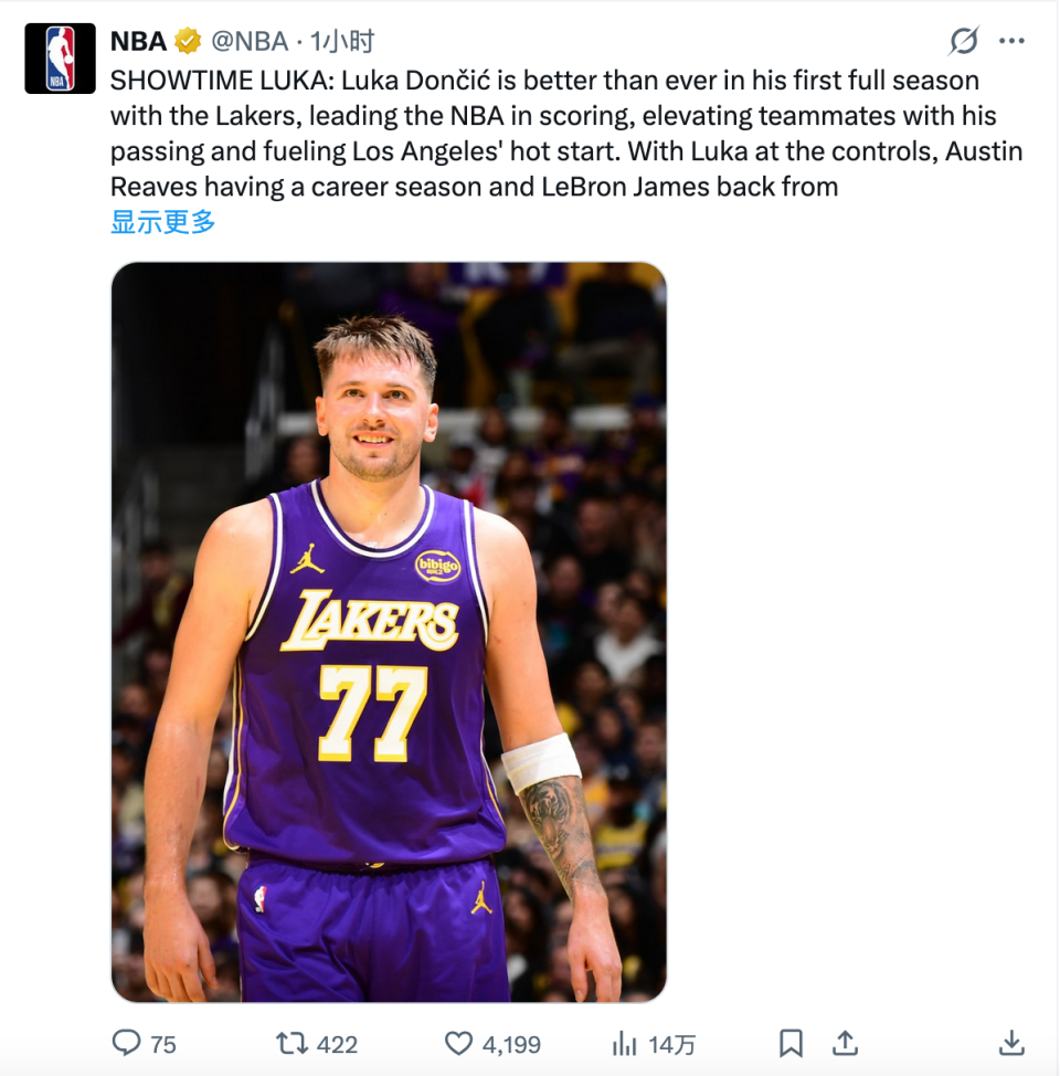 NBA官方发文称赞东契奇:“SHOWTIME”卢卡!这是他加盟湖人的第一个完整赛季,东契奇的表现堪称巅峰,他不仅领跑联盟得分榜,还用精准的传球提升队友的水平,助力湖人队取得了强势开局。有了东契奇的掌控,里夫斯也打出了职业生涯最佳赛季,詹姆斯也从赛季初的伤病中恢复,湖人正持续攀升!”