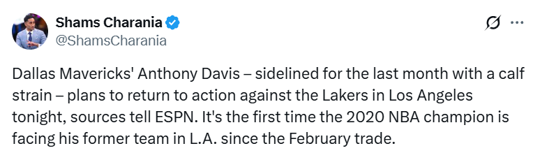 浓眉自10月30日起便一直缺阵,最初他将复出日期定在11月9日客场对阵华盛顿奇才队的比赛。然而,独行侠队老板杜蒙特搁置了这一计划——他听从了达拉斯队健康与表现主管比尔兹伯勒的建议,坚持认为除非有医疗数据表明浓眉不存在小腿拉伤加重的风险,否则不会批准其参赛。在周四的训练结束后,浓眉向记者表示,他将在独行侠队周末背靠背对阵两支洛杉矶球队(湖人与快船)的其中一场比赛中登场。