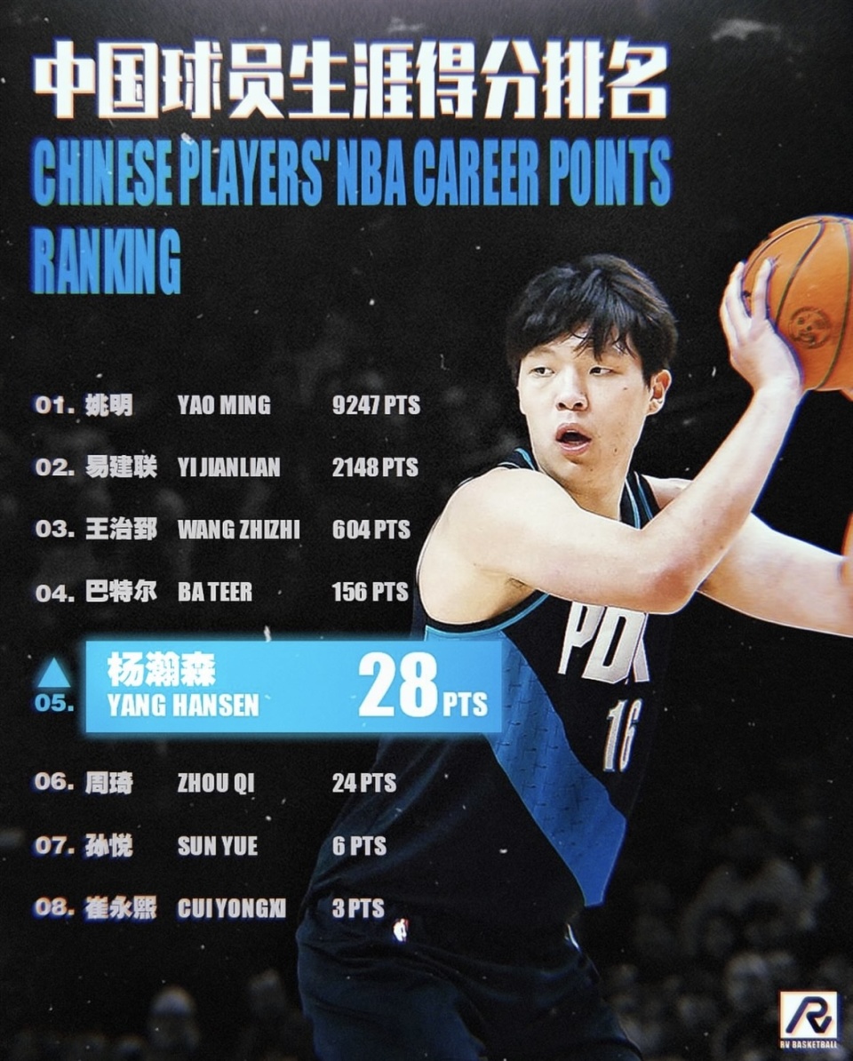 中国球员NBA得分榜:杨瀚森又上升一位 有机会追上易建联?