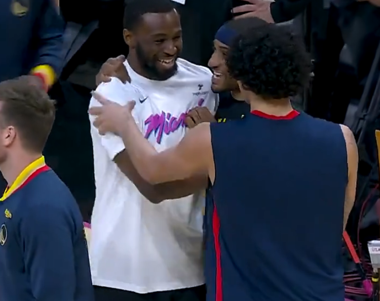 另一边的维金斯,却在挨个与勇士队的球员拥抱致意。
