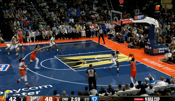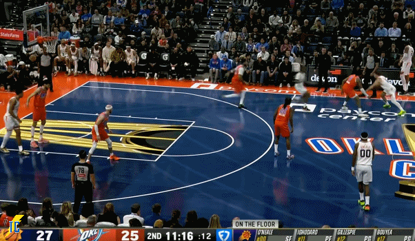 亚历山大回来助攻杰林弧顶命中个人第二个三分,次节4分23秒,雷霆46:40打停太阳。