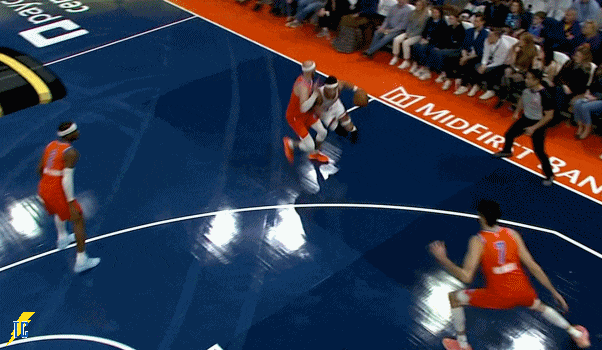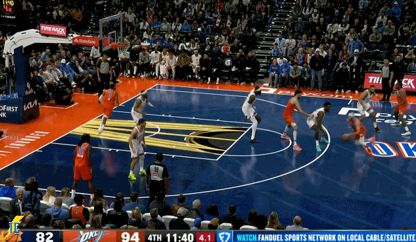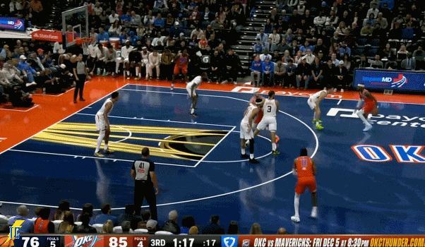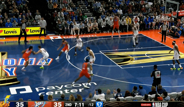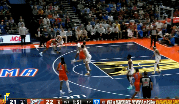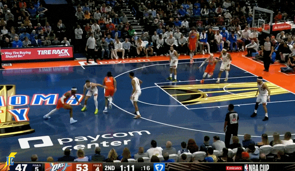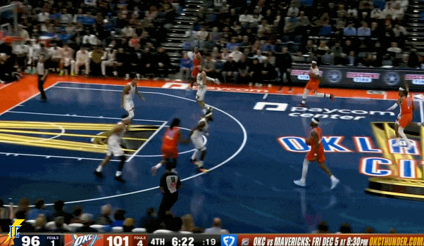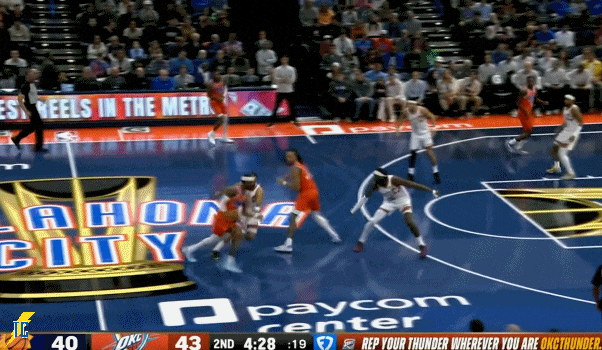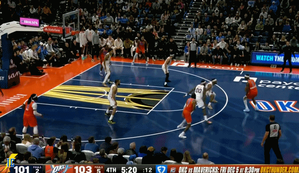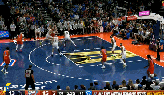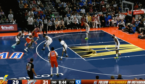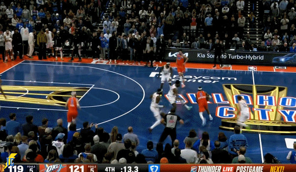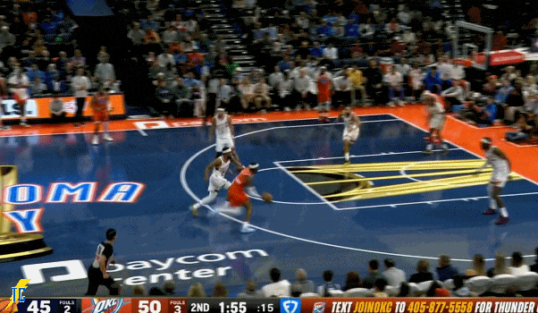 杰伦跑出接球位置后卡鲁索刚好一转头没看着,雷霆叫出最后一个暂停!