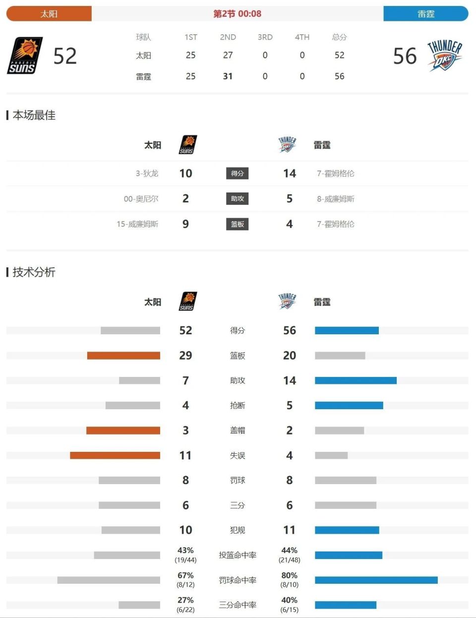 半场结束,雷霆56:52领先太阳进入第三节!