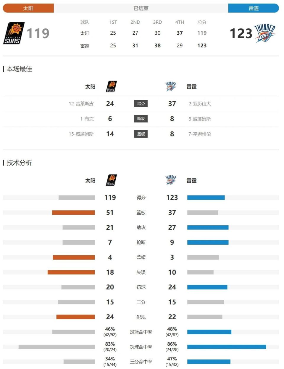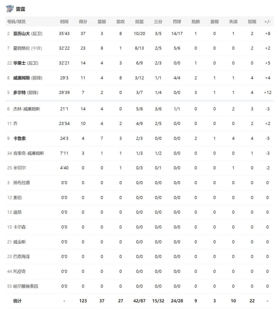 亚历山大20中10砍下37分8助攻,切特13中8拿到23分8篮板,卡森华莱士9中6高效得到14+4+3,杰伦威廉姆斯12中3拿到11分4篮板8助攻2抢断,多尔特7分3抢断!