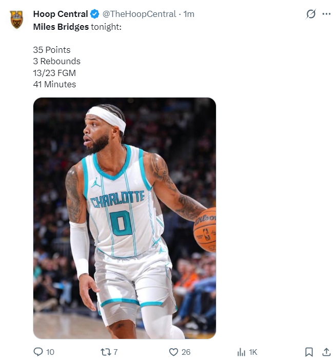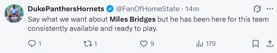 就连黄蜂媒体都写道:尽管我们对迈尔斯-布里奇斯有诸多不满,但他整个赛季都一直为球队做出贡献,随时准备登场作战。