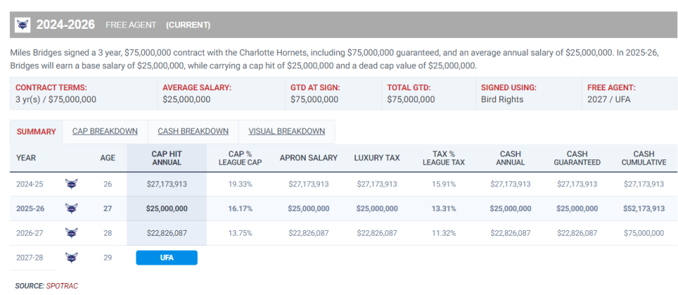 小桥的合同是三年7500万,本赛季为2500万,这还是一份递减合同,下赛季只有2282万。黄蜂能连续击败东部第二猛龙、东部第十公牛,迈尔斯-布里奇斯居功至伟,大家还是理性看待什么刷数据的说法。