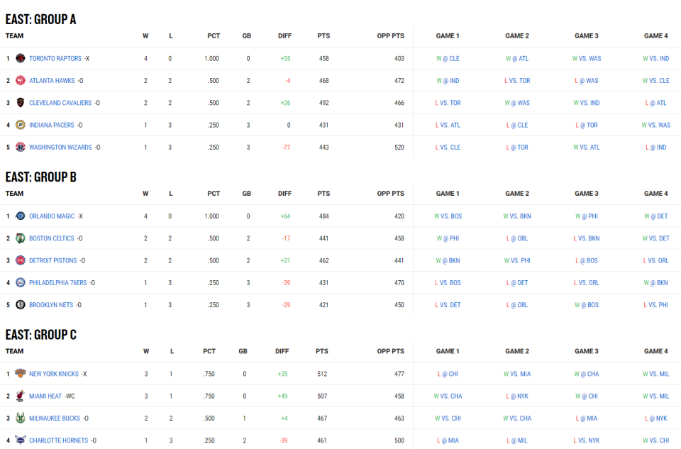 东部这边的情况,猛龙、魔术、尼克斯是以小组第一晋级八强,热火是以东部小组战绩第二好(净胜分最多)的身份晋级。魔术+64力压猛龙+55所以是东部头号种子。